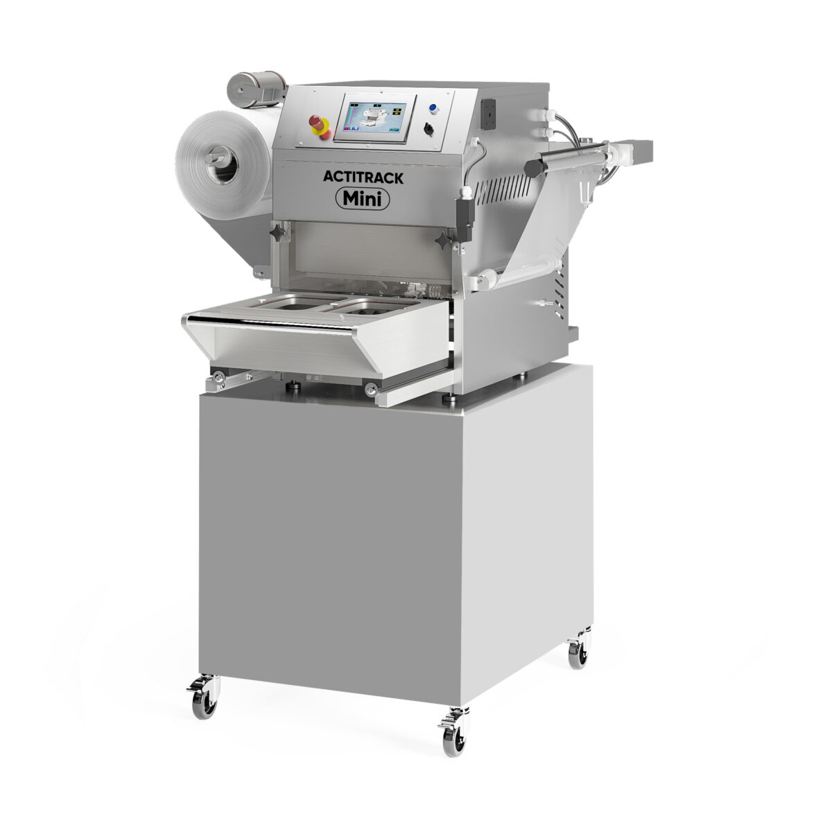 ACTITRACK Mini est une scelleuse au poste semi-automatique à tiroir manuel. Elle est capable de thermosceller en mode simple, sous vide et gaz, ou en mode Skin avec une découpe au contour précis, de manière entièrement automatique.